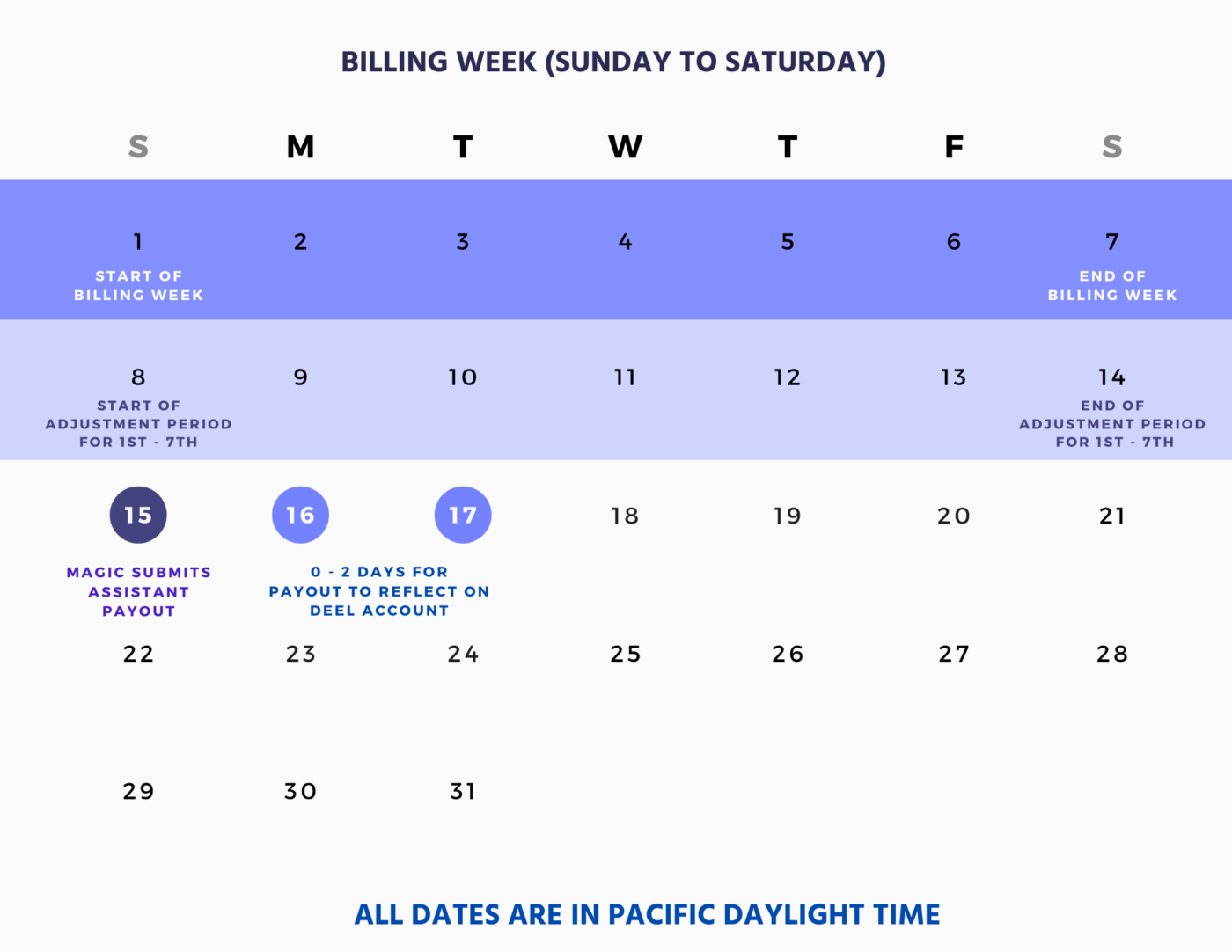 We’ve included an example of what that could look like in the image below. In the example, the first payout would include hours worked between the 4th and the 7th. Also shown are the important milestones during your first few weeks as an assistant.