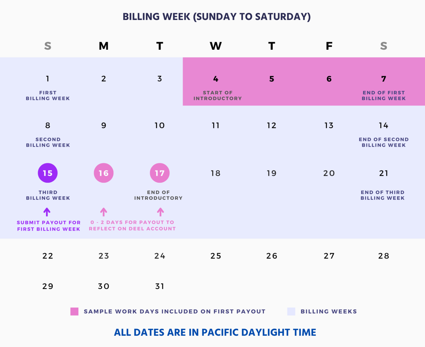 The billing week starts every Sunday at 12AM, Pacific Daylight Time (PDT), and ends on Saturday at 11:59PM PDT of the following week. Pay is processed 8 calendar days after the end of the billing week.
