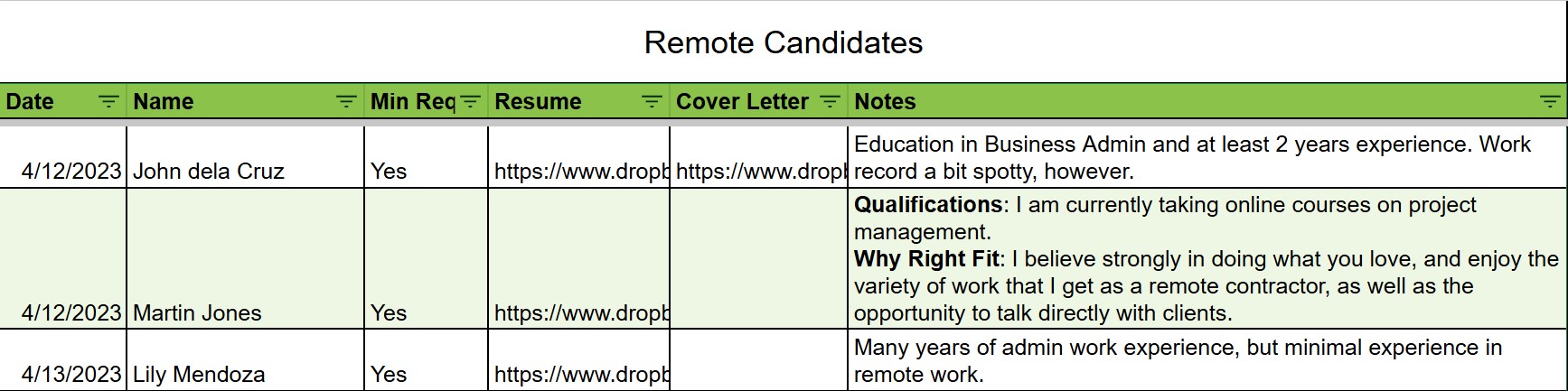 Here’s an example of what a spreadsheet of new applicants should look like: