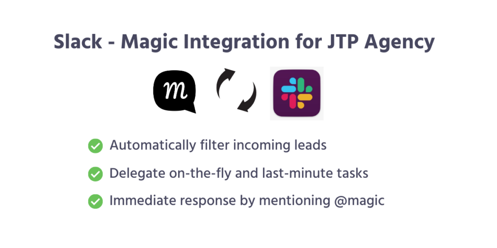 At JTP Agency, Magic is also integrated into Slack. A Slack bot connected to their email and chat support software triggers a prompt each time there’s a new inquiry submitted by a customer. Magic’s assistants then determine whether to handle it themselves or push it to JTP. Magic seamlessly follows the SOP so nothing goes awry.