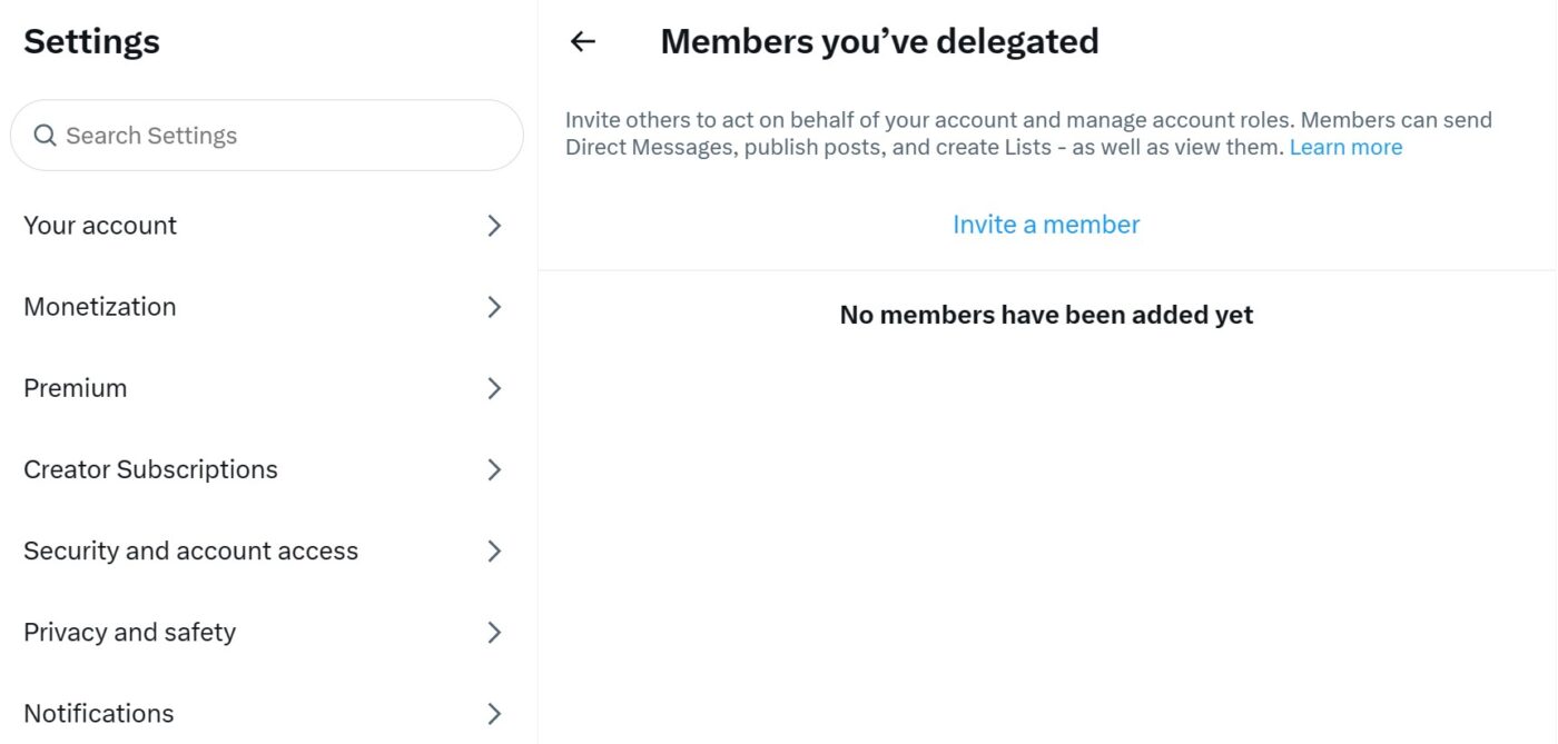In 2023, X added a “delegates” feature to its basic desktop functions. The feature allows you to designate other X users as delegates, which gives them limited access to your account.
