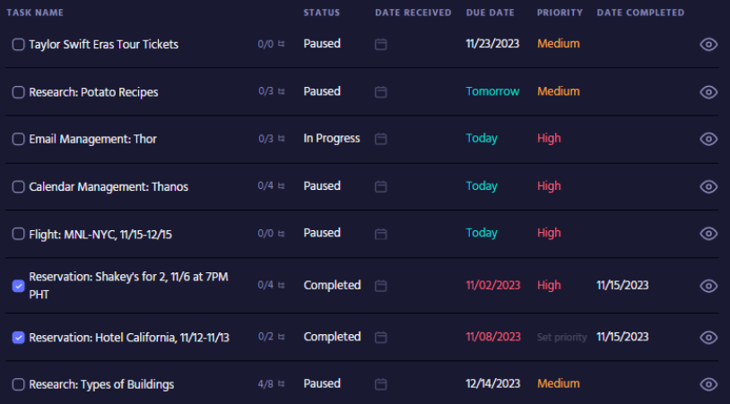 - Main task: Reservation: Shakey’s for 2, 11/6 at 7PM PHT