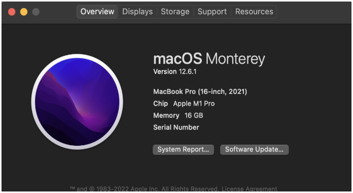 Step 2. Select About this Mac to display the information as shown below. It is advised that you blur/erase sensitive data like the Serial Number for added security