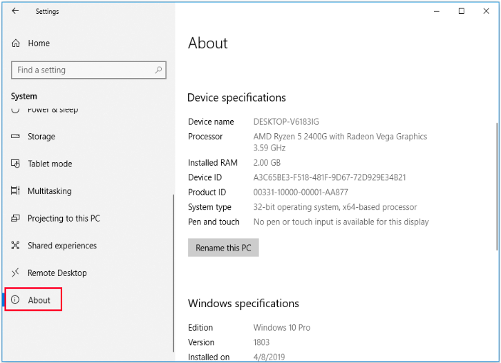 Step 1. Click Start > Settings > System > About, to check the computer and Windows 10 system specifications