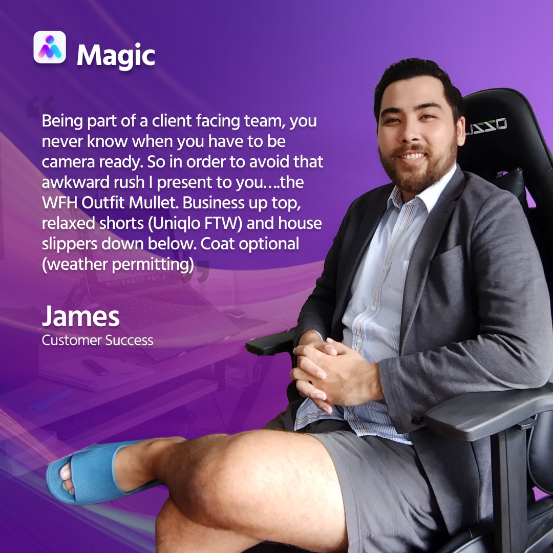 “Being part of a client facing team, you never know when you have to be camera ready. So in order to avoid that awkward rush I present to you….the WFH Outfit Mullet. Business up top, relaxed shorts (Uniqlo FTW) and house slippers down below. Coat optional (weather permitting)”