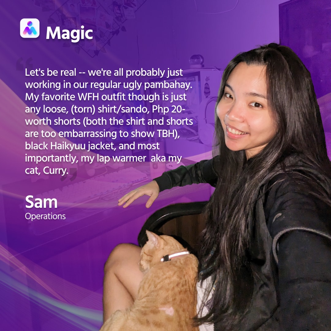 “Let’s be real — we’re all probably just working in our regular ugly pambahay My favorite WFH outfit though is just any loose, (torn) shirt/sando, Php 20-worth shorts (both the shirt and shorts are too embarrassing to show TBH), black Haikyuu jacket, and most importantly, my lap warmer aka my cat, Curry, who always sleeps on my lap during my shift!! Pls consider him as fur clothing lol”