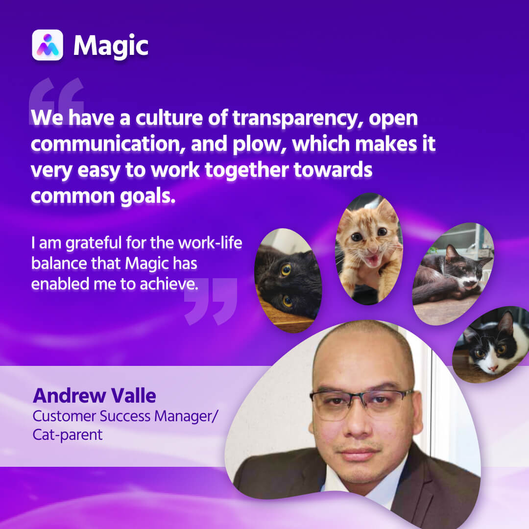 My wife and I have dedicated our time to building a small shelter for stray cats and dogs in our neighborhood. However, balancing our passion project with our professional lives can be at times challenging. Fortunately, working at Magic has provided me with the flexibility to pursue both without sacrificing one for the other. Whether it’s driving to our local vet or rushing to rescue a kitten in need, I am grateful for the work-life balance that Magic has enabled me to achieve.